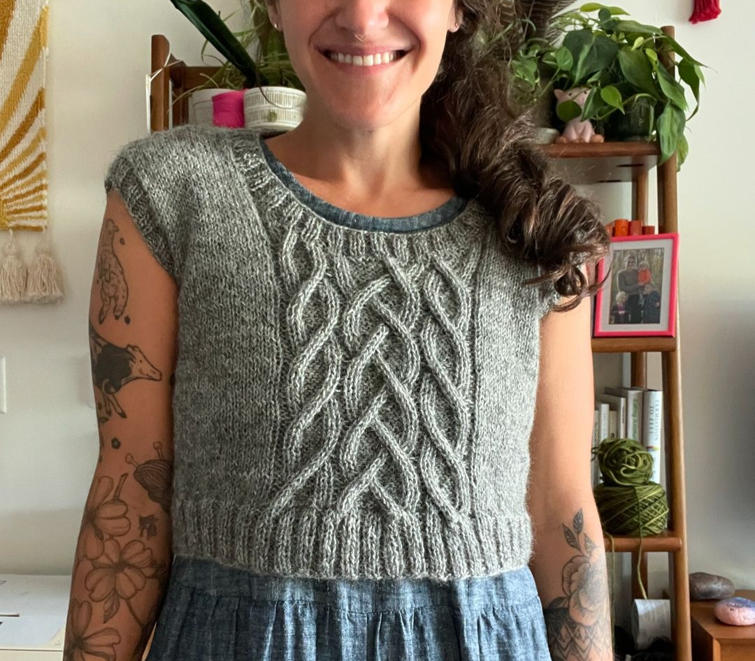 Our Gotland yarn works perfectly for Ramona’s Vest pattern, a collaboration with New England knitwear designer Annie Lupton. She designed a sweet cropped cabled vest pattern named, “Ramona”. The vest features braided cables up the front. It’s perfect for fall and winter layering! Just three skeins will knit the size small vest. Visit Annie’s Ravelry page to purchase her pattern.