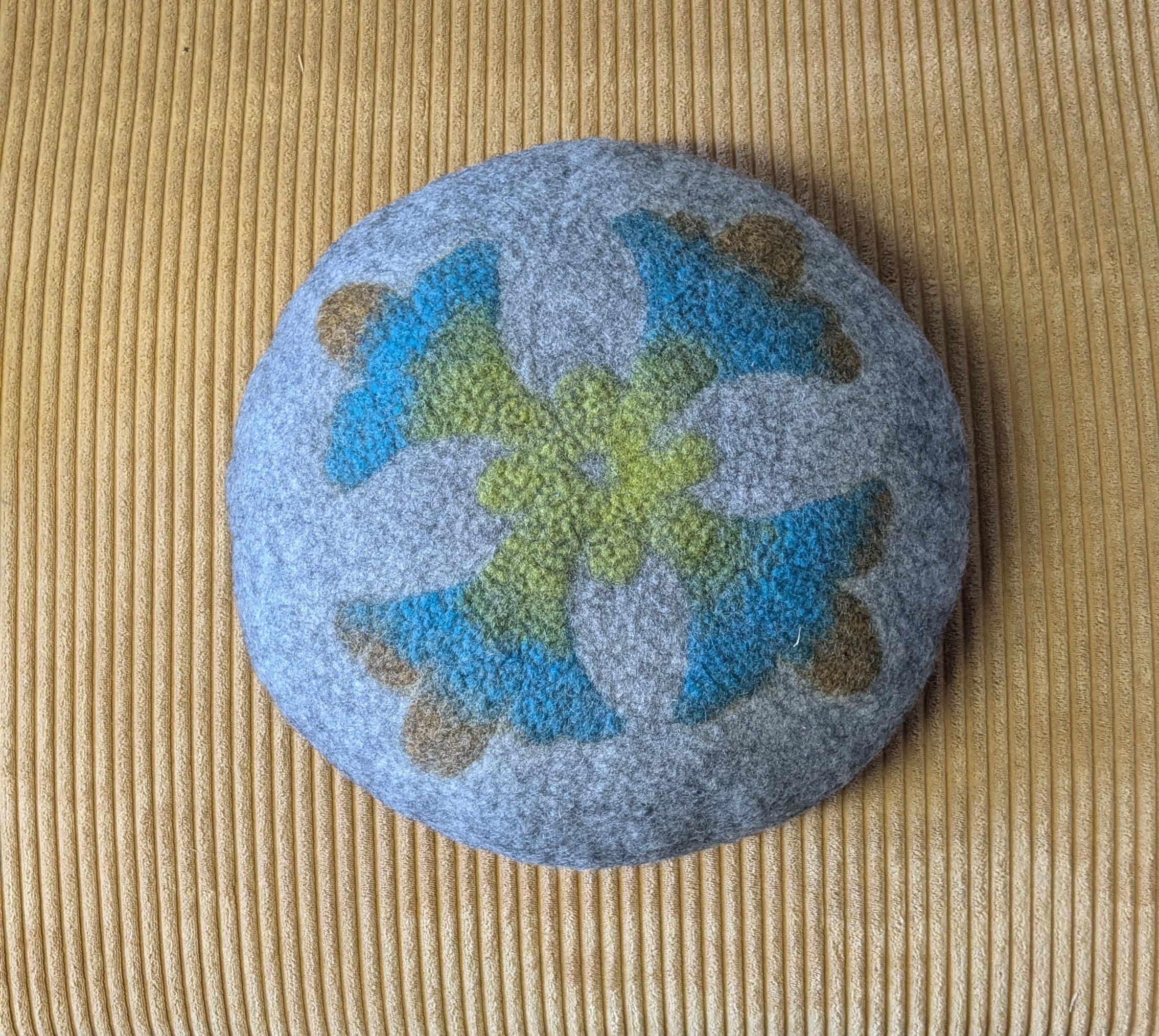 Floor cushions have been a top seller this year at the sheep festivals!! Kim is excited to offer wool felted floor cushions handcrafted from our premium Gotland wool and stuffed with organic buckwheat hulls! Each cushion is hand felted in Kim’s barn studio. She uses the natural calming gray tones of Gotland wool and just a hint of color in her designs. This farm-to-home product will quickly become a favorite in your home. It offers unparalleled comfort and support, perfect for a multitude of activities. Stuffed with organic buckwheat hulls, the cushion molds to your body as you sit giving each individual the under seating support they need, where they need it. Gotland and merino wool outer covering adds durability to your floor cushion.